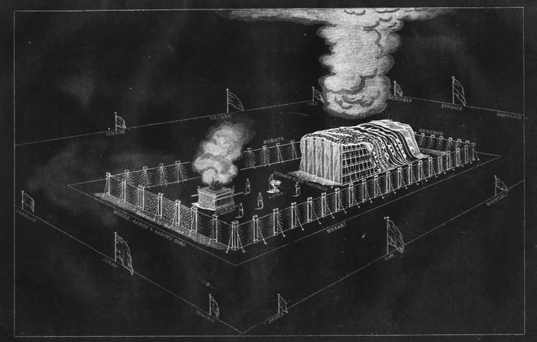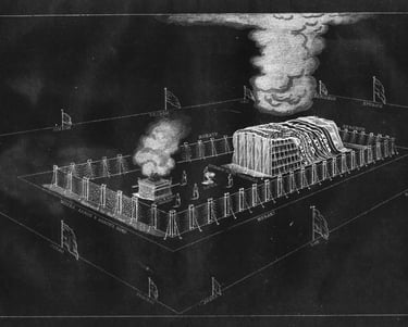 In the center of the court you will see the brazen altar and the washing laver. On the opposite end of the courtyard is a tent which contains the Holy Place and the Holy of Holies.